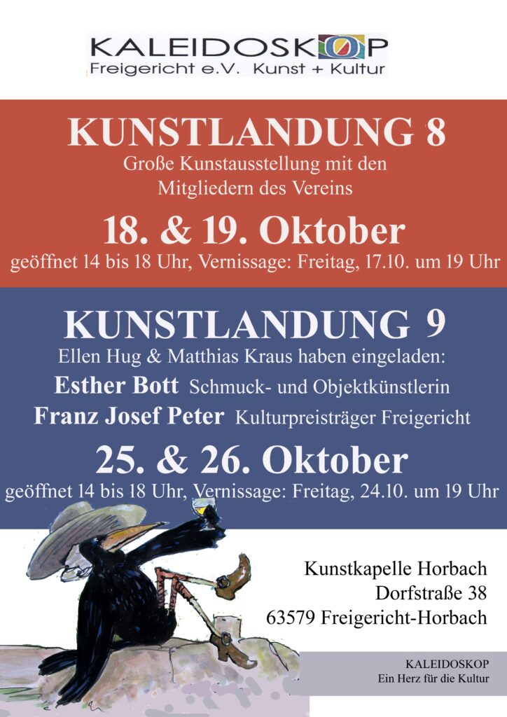 Ausstellung “ Kunstlandung 8″ in der Kapelle Horbach Veröffentlicht am 6. Oktober 2025 von Sina Schulz Ausstellung “ Kunstlandung 8″ in der Kapelle Horbach Herzliche Einladung zur diesjährigen Kunstausstellung des Kaleidoskop Freigericht. Ich bin ebenfalls mit meinen Bilder vertreten und freue mich auf euren Besuch.